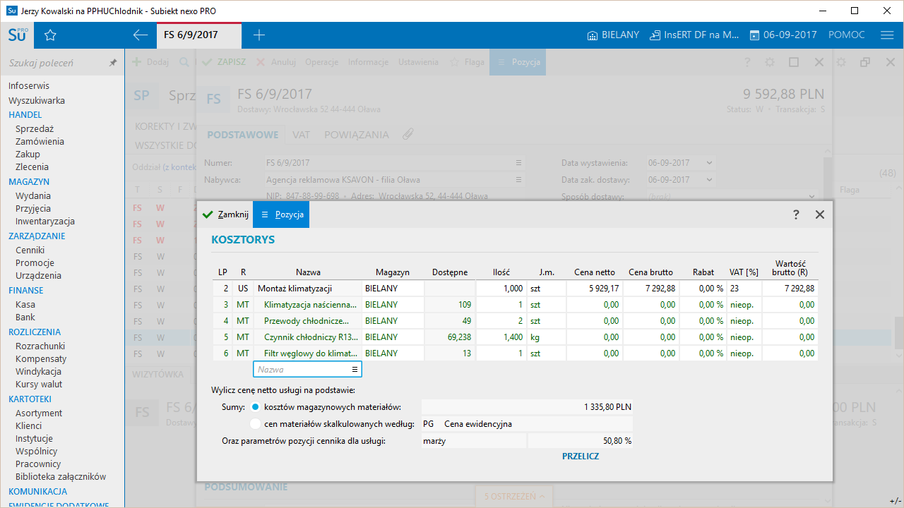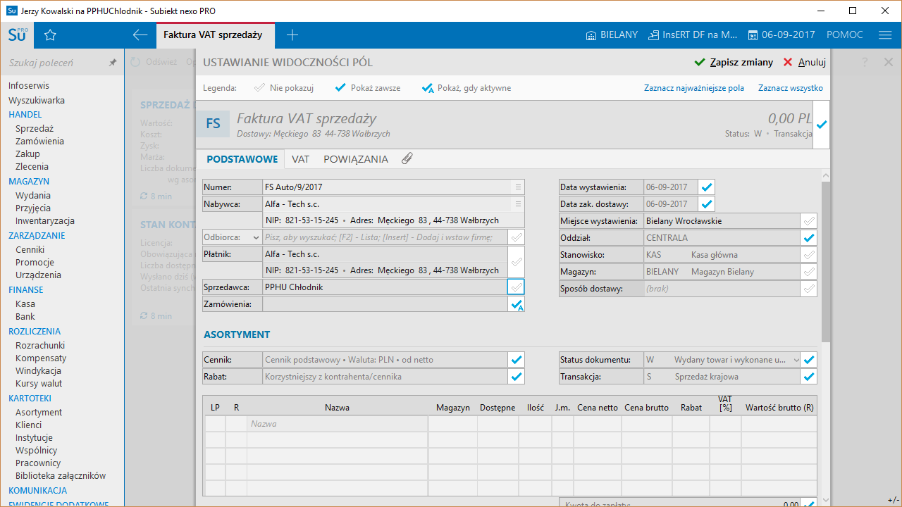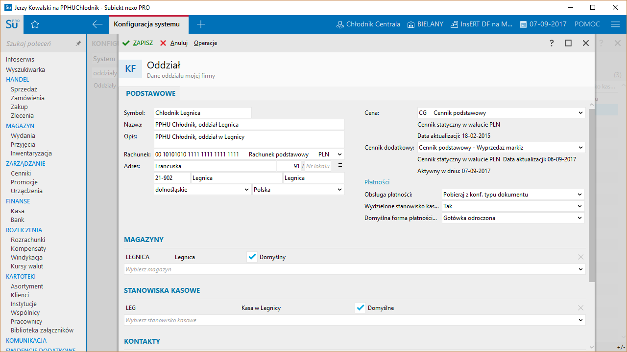 - obsługa oddziałów firmy (z każdym oddziałem jest związany cennik główny, który jest domyślny dla każdego wystawianego do niego dokumentu handlowego)