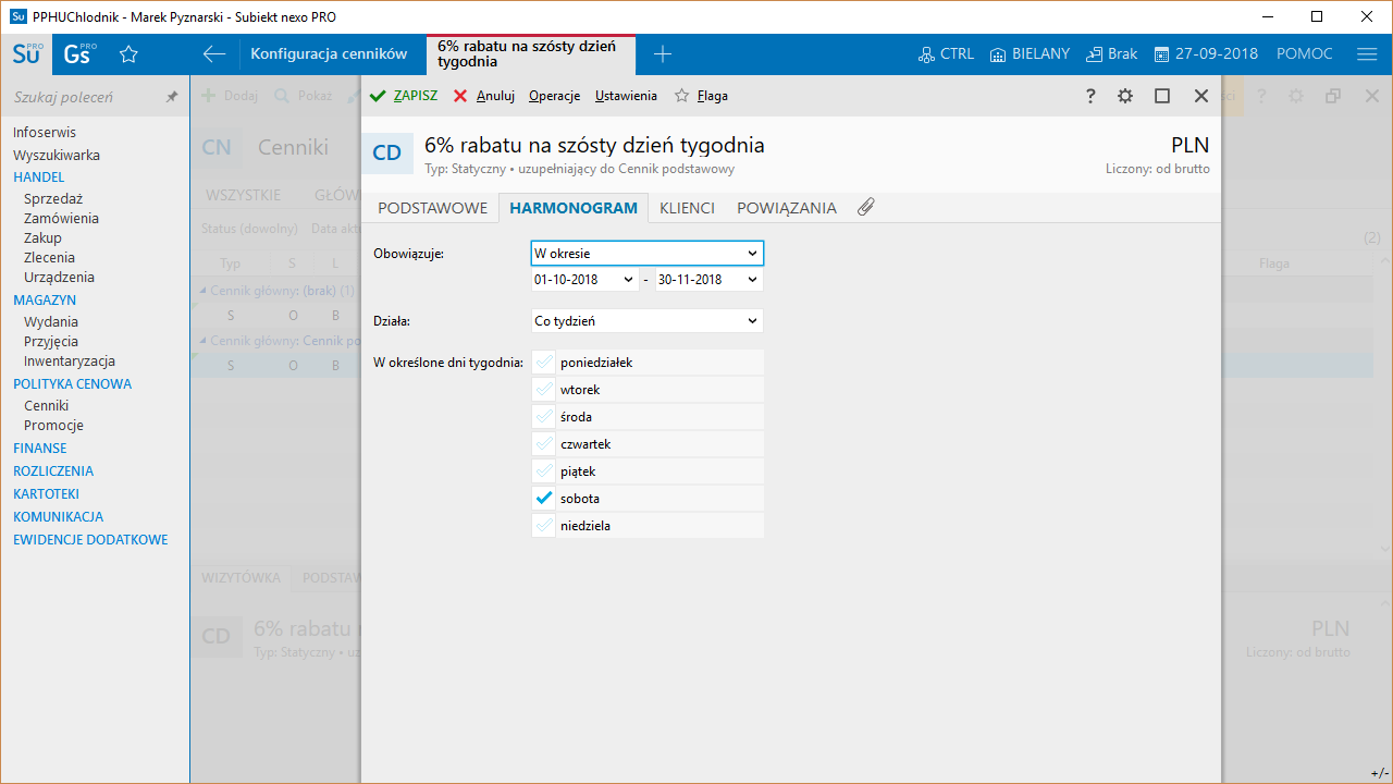 - możliwość zdefiniowania cenników dodatkowych (dotyczących części cennika głównego, można je ograniczać czasowo)