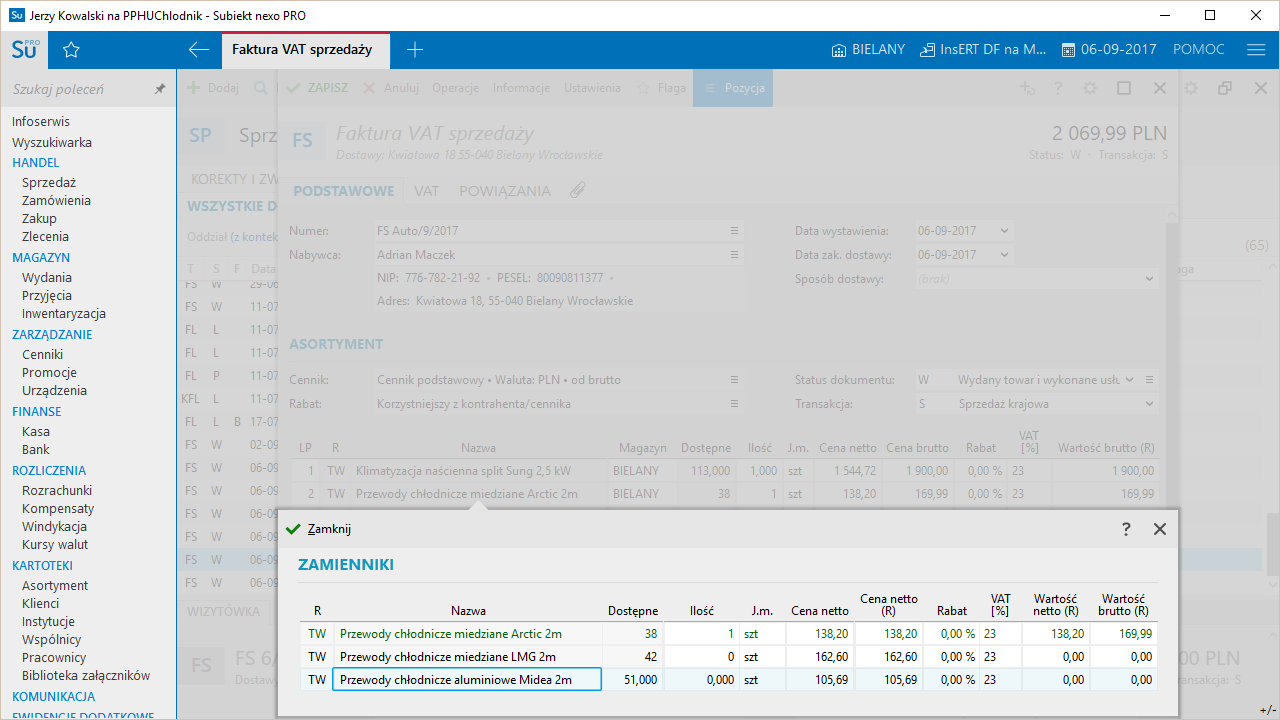 - obsługa zamienników – prostych zbiorów towarów bądź usług, które na dokumentach można wymienić za pomocą specjalnej funkcji pomiędzy elementami z tego samego zbioru