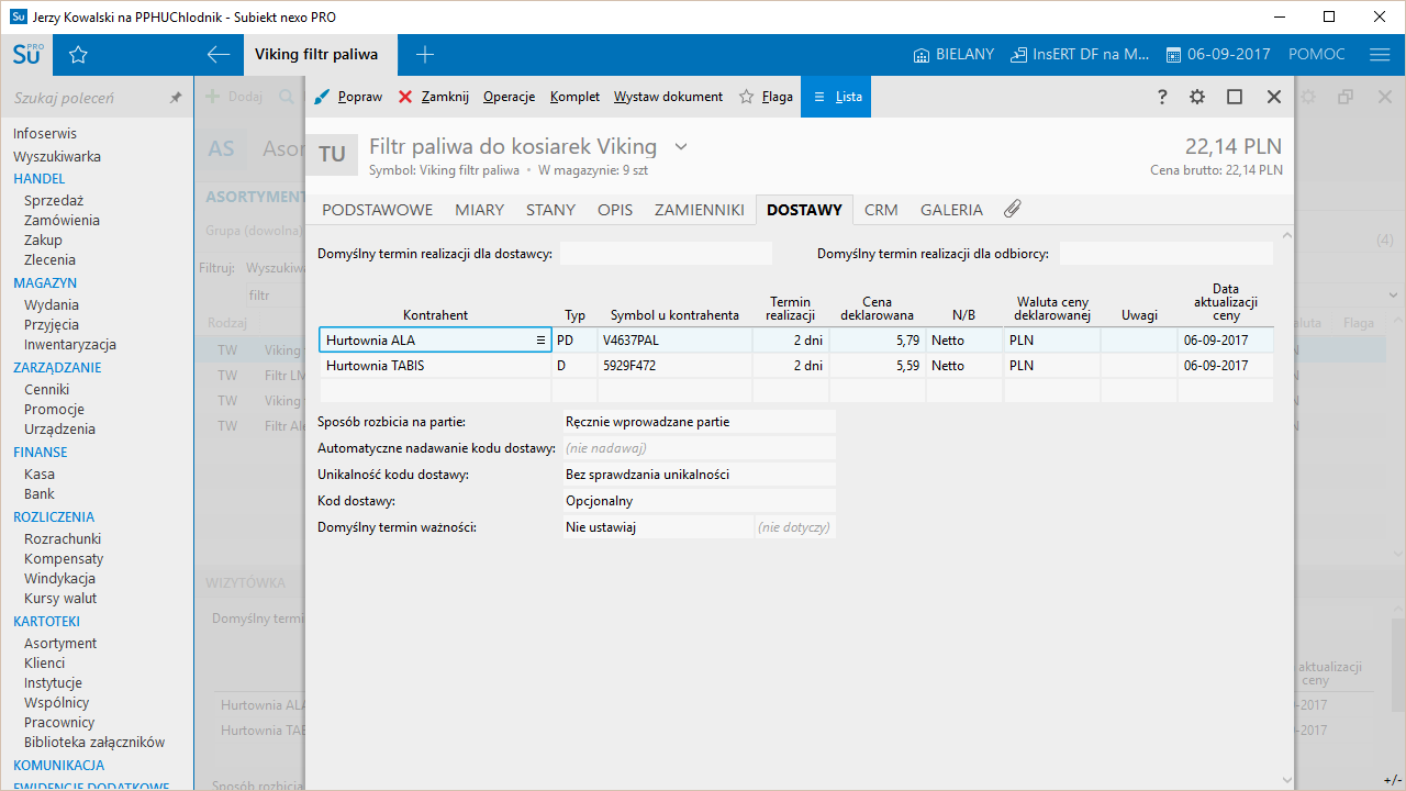- możliwość zdefiniowania wielu dostawców asortymentu z wyróżnionym jednym głównym dostawcą i producentem (każdemu dostawcy można przypisać dla danego asortymentu zarówno zestaw jego indywidualnych symboli, jak i terminy dostawy)